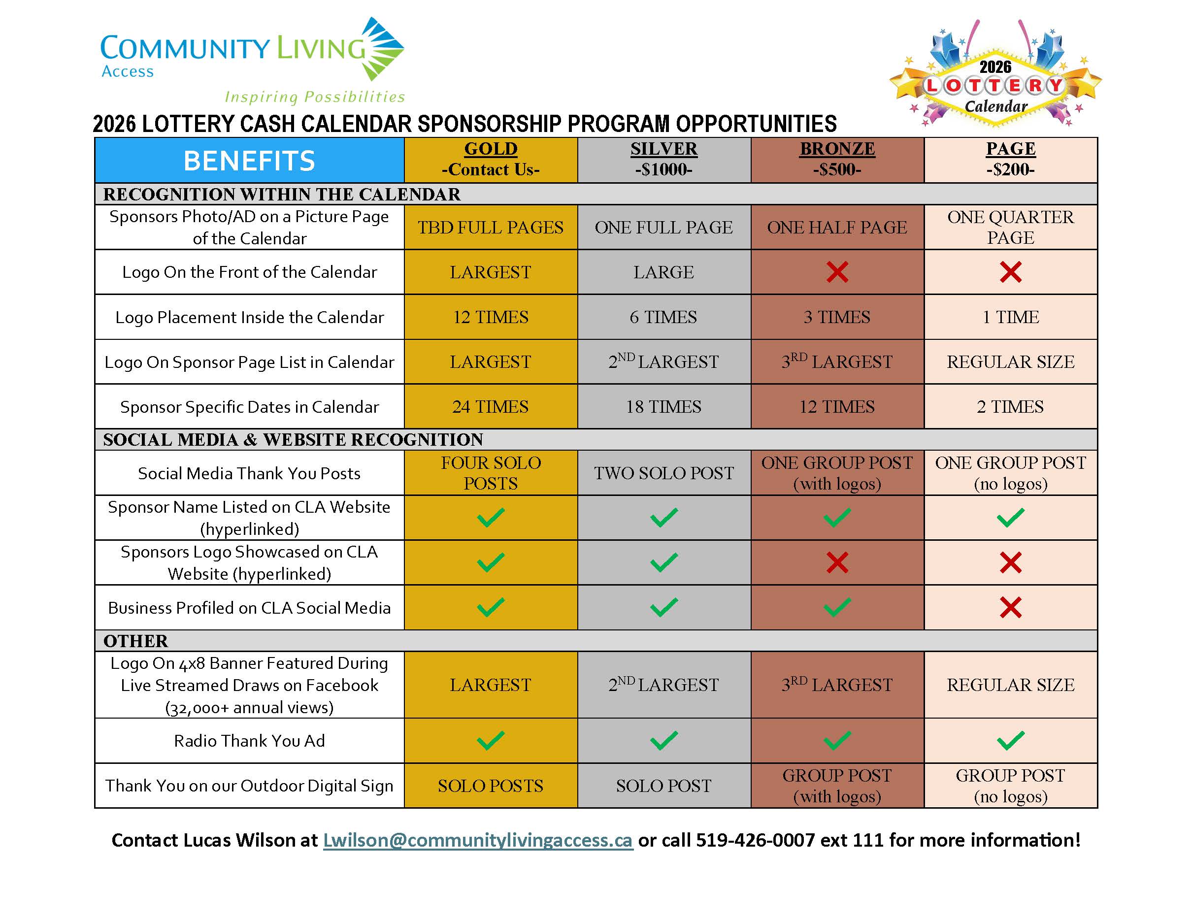To sponsor our 2026 Lottery Cash Calendar please contact Lucas Wilson at lwilson@communitylivingaccess.ca  or call 519.426.0007 Ext. 111.